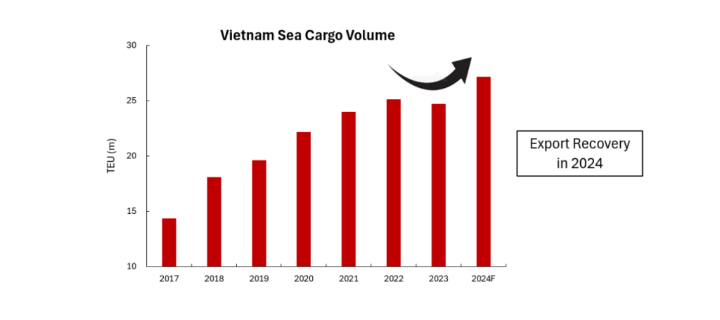 Exports began recovering in mid-2023, resulting in higher capacity utilization of ports in Vietnam. Those recoveries, coupled with the announcement that Government-regulated port handling fees would increase by around 10% this year, were the initial catalysts for the surge in logistics stock prices over the past year, although other factors discussed below also supported the stock prices of both logistics’ companies and of industrial park developers, which are also up approximately 50% yoy.