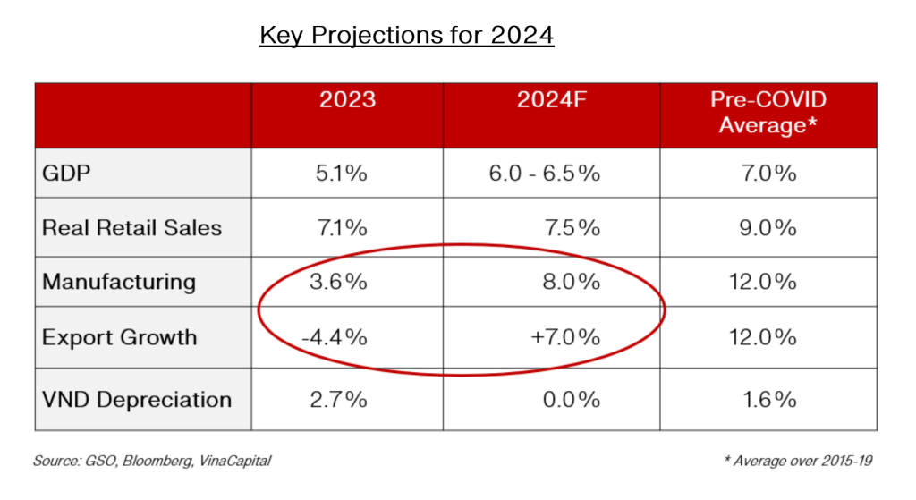 1. Manufacturing output growth is likely to recover from less than 4% in 2023 to 8-9% in 2024, which is still below pre-COVID growth levels because of the weakening US/global economy (most products manufactured in Vietnam are exported, especially to the US).