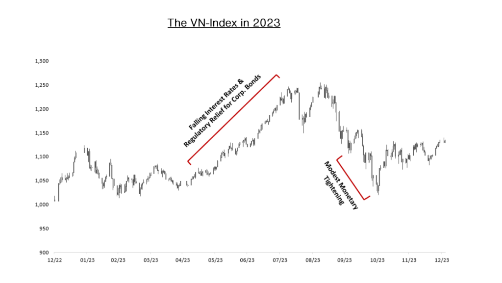 In 2023, Vietnam’s stock market was driven higher – and then lower – by monetary policy, but the VN-lndex finished the year up 12.2% in VND terms and 9.3% in USD terms. Specifically, a drop in deposit interest rates, coupled with steps the Government took to support the country’s corporate bond market in March9 drove a rally the pushed the VN-lndex up as much as 25% (YTO) over the next six months, despite Vietnam’s weak economy at that time. And then in September, the SBV tightened monetary policy in response to a ~4% YTD depreciation in the VN Dong, which helped fuel the 16% correction in the VN-lndex that can be seen below.