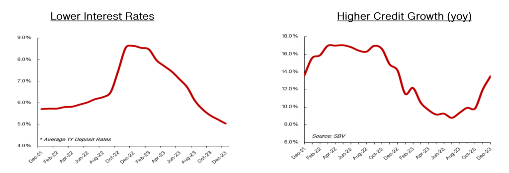 We expect Vietnam’s GDP growth to increase to 6-6.5% in 2024, driven by a rebound in the manufacturing sector and by improvements in consumer sentiment and spending. Manufacturing had already started rebounding in late-2023 because the demand for “Made in Vietnam” products – especially for consumer electronics products – from consumers in the US/EU started to recover last year.