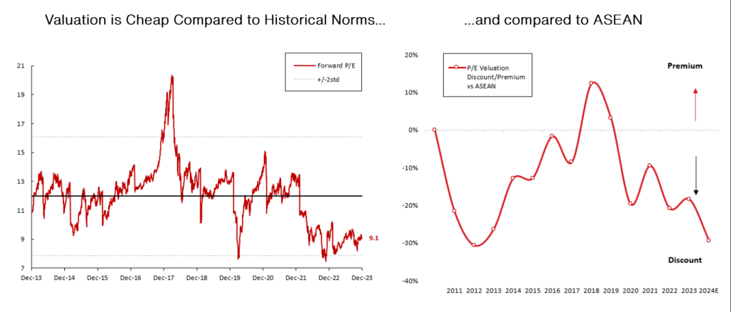 Bank stocks should benefit from an acceleration in their earnings growth from around 7% in 2023 to 18% in 2024 and the valuation of bank stocks in Vietnam is currently more than one standard deviation below its five-year mean (banks are currently trading at about 1.8x P/B versus circa 17% expected ROE in 2024). We expect the earnings of Vietnam’s banks to be driven by an acceleration in credit growth to both real estate developers and to the end-buyers of newly constructed housing units, in-line with our expectation for a modest pick-up in real estate development this year.
