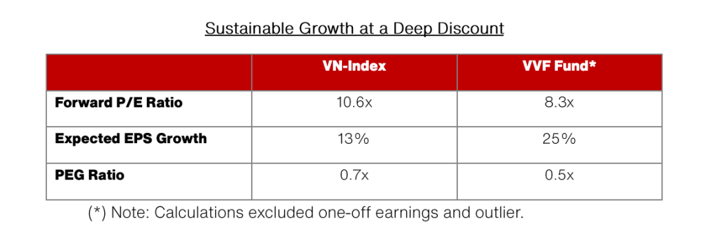 For example, the market’s overall valuation is already attractive at 1Ox Forward P/E versus 10-15% EPS growth, which equates to a Price-Earnings-Growth (PEG) ratio of about 0.7x (legendary stock market investor Peter Lynch popularized picking stocks with PEG ratios below 1x), but as can be seen in the table below, the specific stocks in our VVF Vietnam Equity UCITS Fund are trading at a P/E ratio of 8x and we expect the earnings of those stocks to grow by 25% this year.