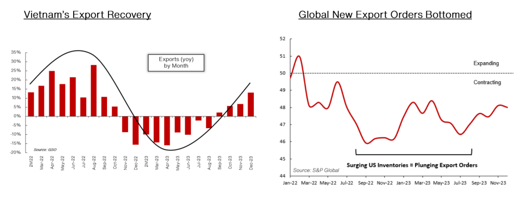 In 2023, a plunge in Vietnam’s manufacturing output and exports were the biggest drags on the economy, just as we predicted in our “Looking Ahead at 2023” report, which was a non-consensus call at that time. However, Vietnam’s longest streak of falling exports in over a decade has already bottomed out and export growth is likely to accelerate to some degree throughout 2024.