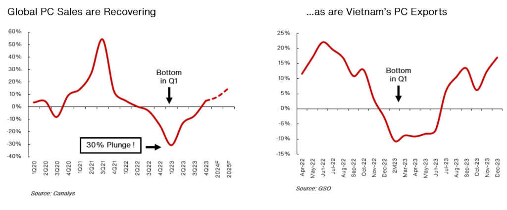 Computers and electronics exports are already rebounding, although exports of smartphones and low value garment products are still falling (note that each of those three product categories accounted for about 15% of Vietnam’s total exports last year). Sales of PCs and other “work from home” products plunged post-COVID, but users have started upgrading to computers that are sufficiently powerful to run AI applications.³ This helps explain why market research firm Canalys expects global PC sales to rebound from a 12% drop in 2023 to nearly 10% growth in 2024.