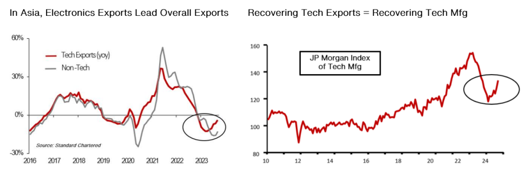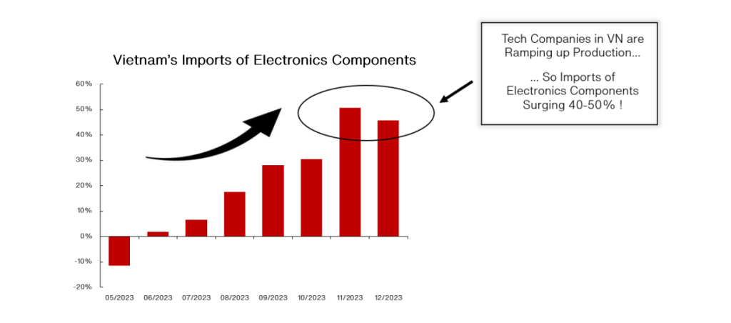 The net result of all of the above is that “the tech sector has bottomed out…led by consumer electronics replacement demand” as Standard Chartered noted in its 2024 global strategy report. Standard Chartered also observed that electronics exports tend to lead overall export recovery/growth in Asia, which bodes well for Vietnam’s overall exports in 2024, while JP Morgan’s 2024 strategy report highlighted the resulting rebound in Asia-wide tech manufacturing output, which bodes well for GDP growth.