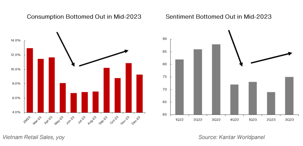 The same newspaper published an article a month earlier lamenting that “Affordable apartments are disappearing in Hanoi, HCMC”. We highlight this cognitive dissonance because misperceptions about the true health of Vietnam’s property market weighed disproportionately on consumer sentiment last year. Consequently, the growing perception that the country’s real estate market has started to thaw (which we discussed in this report) should boost consumer spending as 2024 progresses.