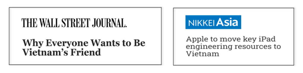 Last year, Vietnam’s appeal to foreign investors continued to improve, as did the quality of the FOi the country attracted, which is captured in the two newspaper headlines above. The most important developments on both of these fronts were: